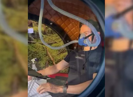 Anti-Ageing Millionaire Bryan Johnson Moves His Office Into Hyperbaric Oxygen Chamber, working on his computer while wearing an oxygen mask over his mouth and nose.